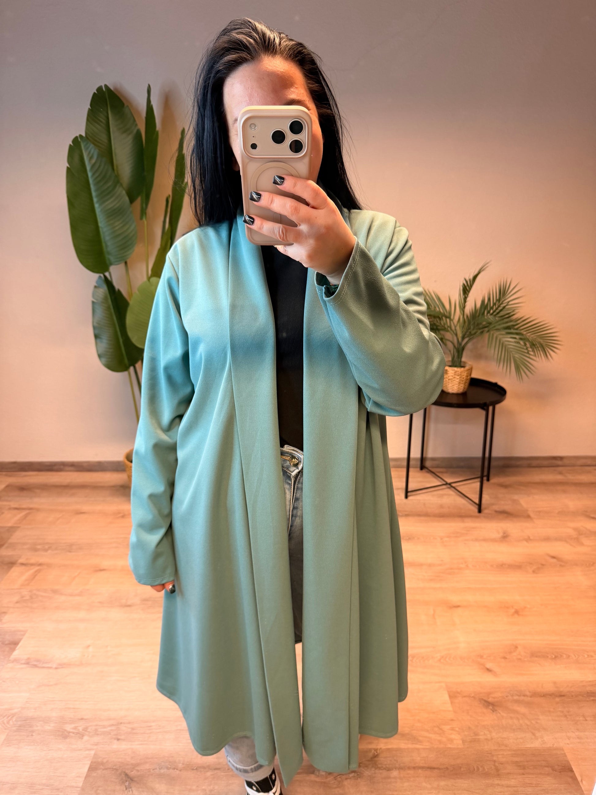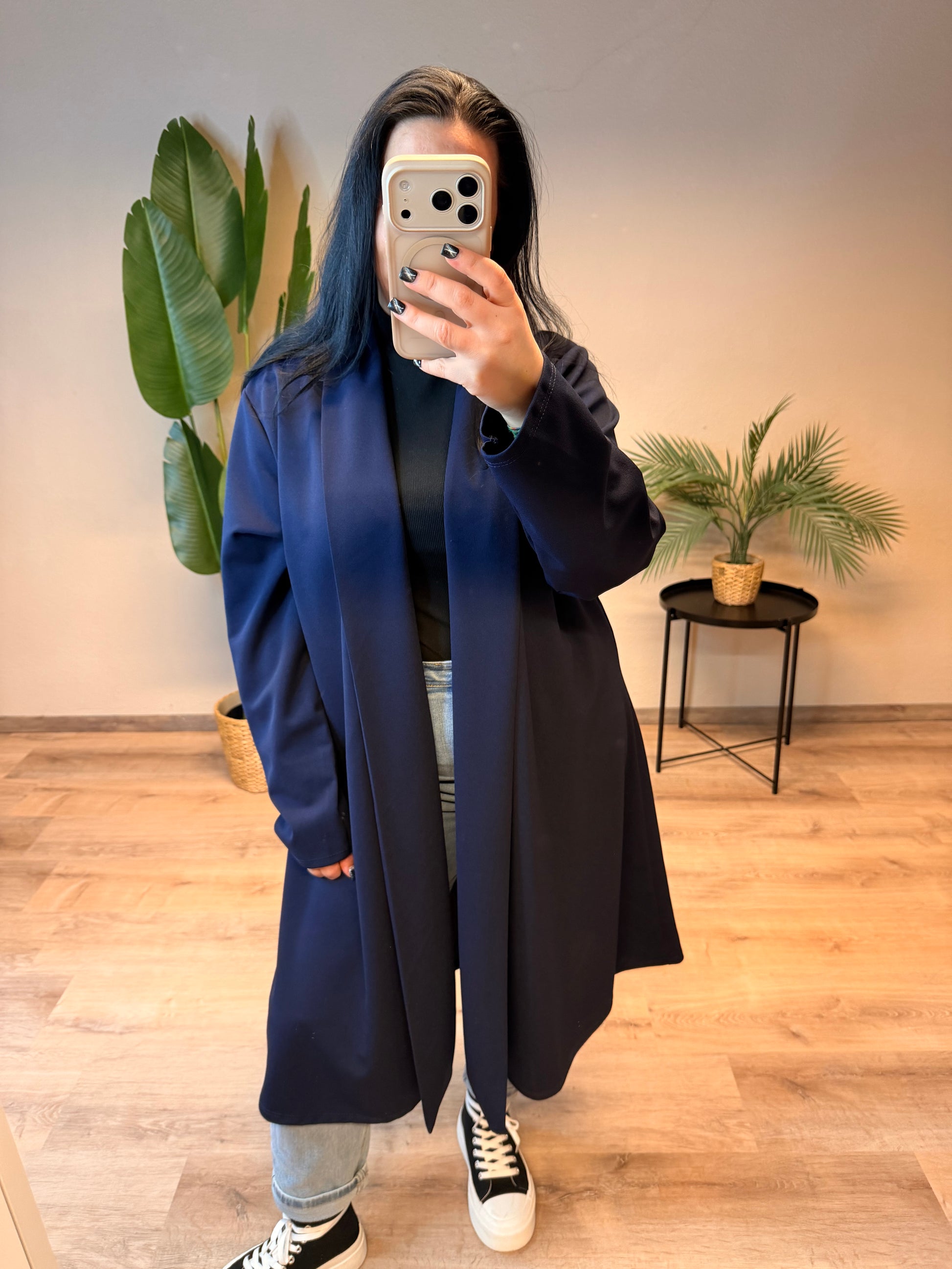 Dieser lässige Cardigan in Blazer-Optik vereint Eleganz und Komfort auf besonders stilvolle Weise. Der offene Schnitt sorgt für eine fließende Silhouette und macht das Modell extrem vielseitig. Dank der lockeren Passform passt der Cardigan bereits ab Größe 38 und kann offen getragen problemlos bis Größe 52 gestylt werden. Die lange Form streckt optisch und macht ihn zum perfekten Begleiter für Alltag, Büro oder besondere Anlässe.