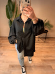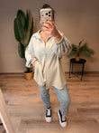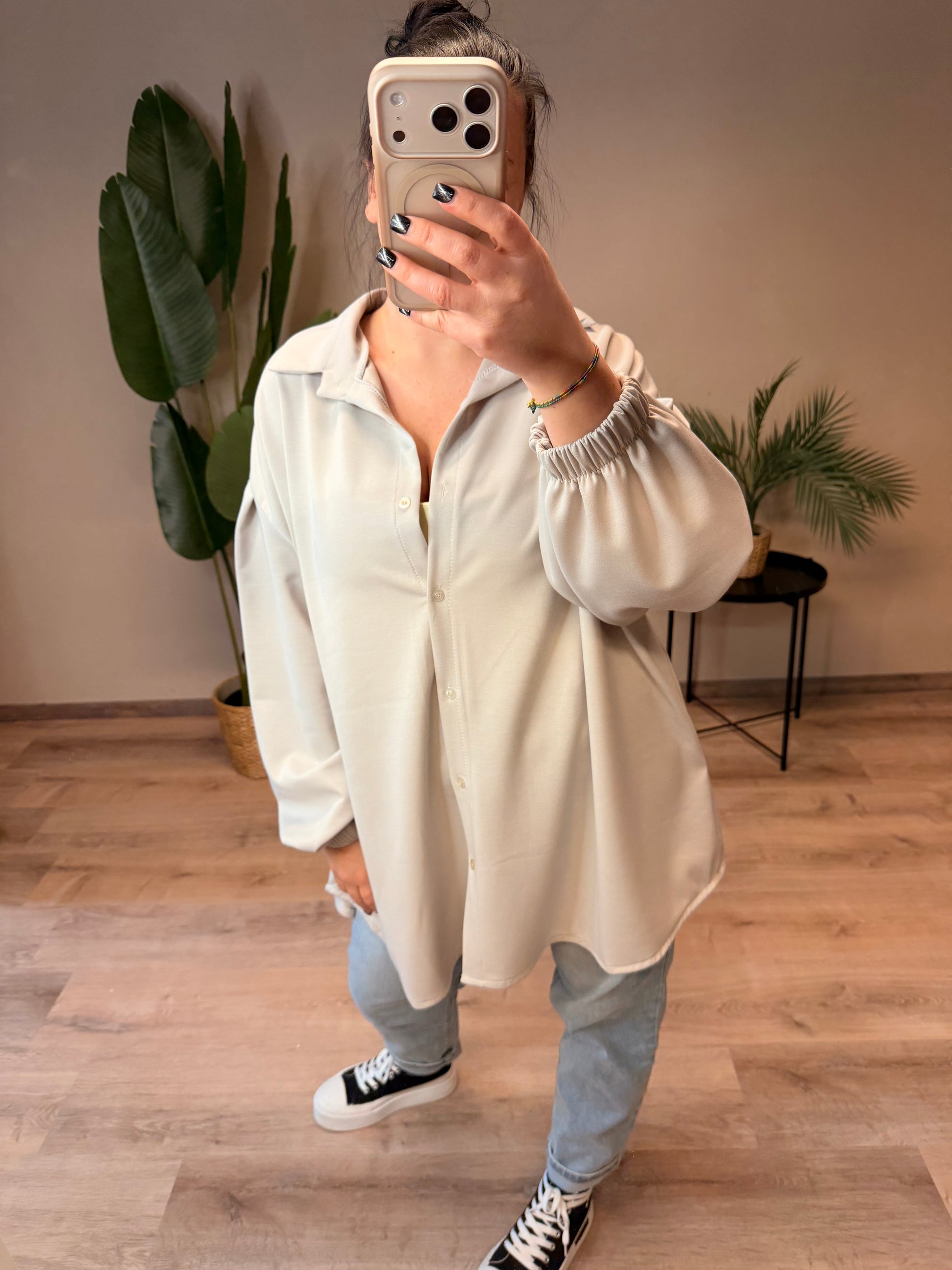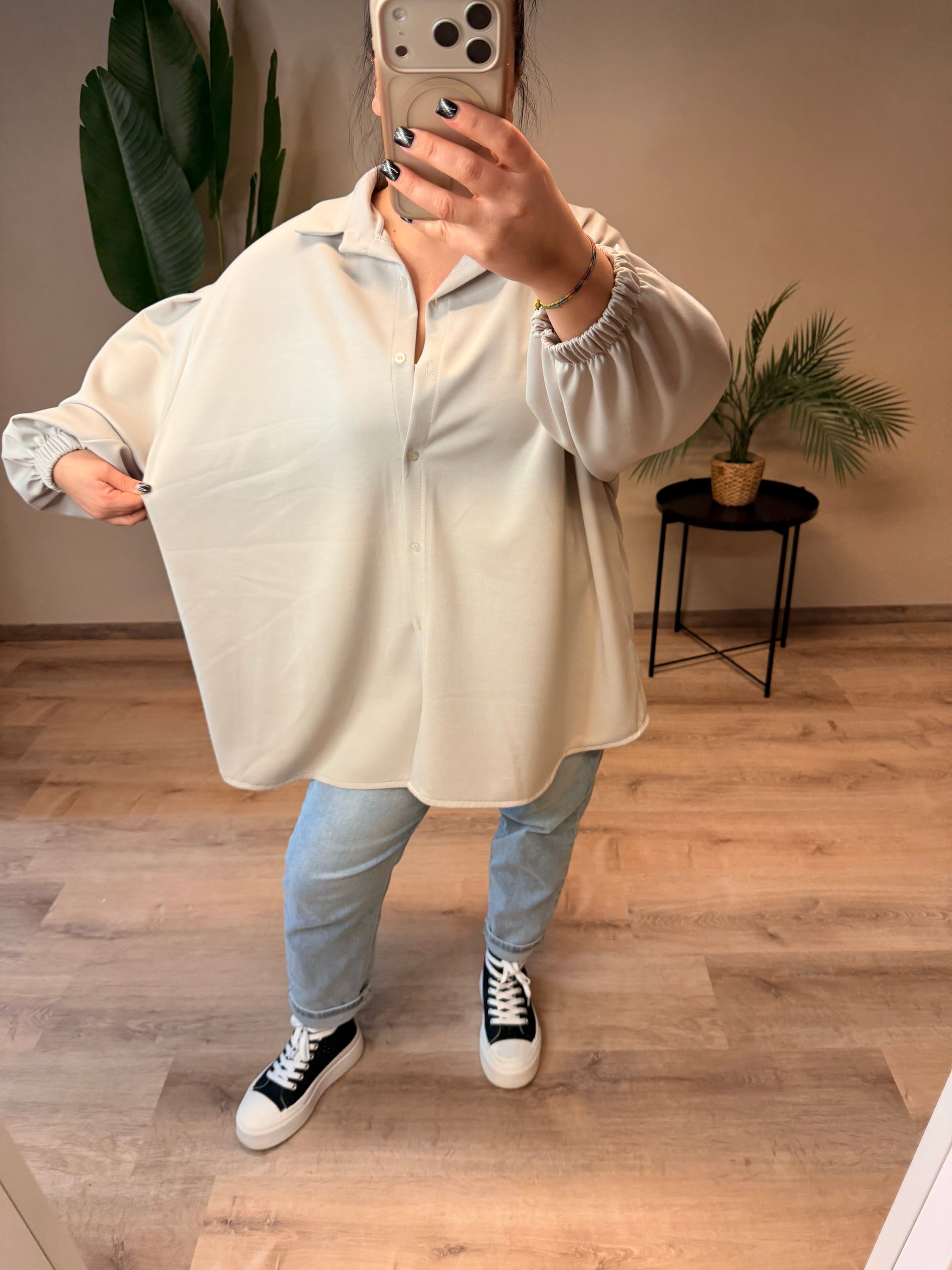 Diese super tolle Butterstoff-Bluse ist ein echtes Multitalent – sie kann sowohl klassisch als Bluse als auch lässig offen als Cardigan getragen werden. Die elastischen Gummizüge an den Ärmeln sorgen für Komfort und einen modernen Look. Dank des oversize Designs ist sie bequem ab Größe 44 tragbar und reicht bis Größe 52. Ein stylisches Wohlfühlteil für vielseitige Outfits.